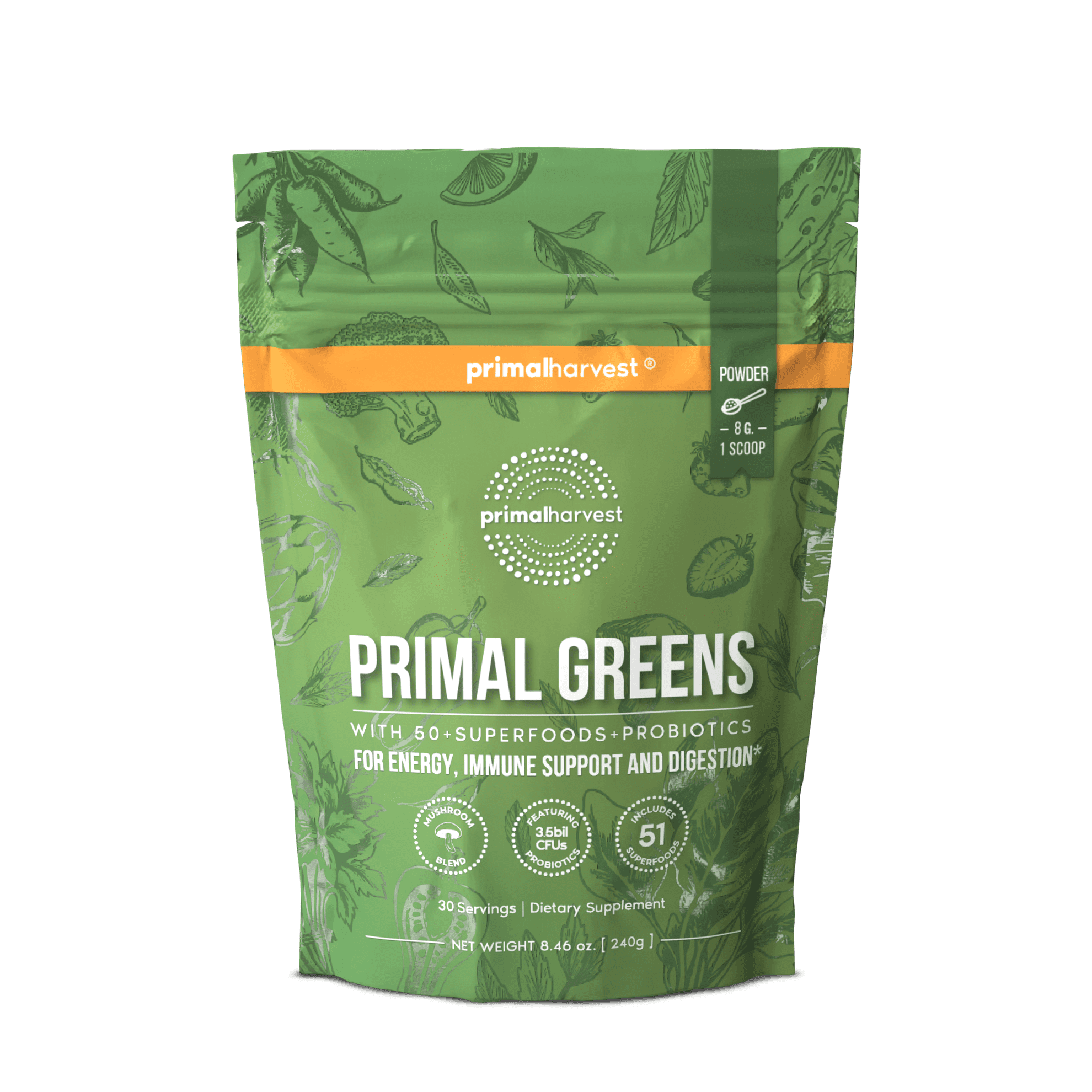 Primal Greens by Primal Harvest features over 50 fruits, vegetables, herbs, spices, and mushrooms, Primal Greens delivers tons of nutrients with just one scoop per day. It's sweetened with plant-derived sweetener and provides 2.4 g of dietary fiber, as well as 31 billion CFUS of probiotics.