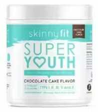 Super Youth Collagen by SkinnyFit includes 7.8g of hydrolyzed collagen per scoop, sourced from grass-fed bovine collagen and fish collagen. The container consists of 58 servings of chocolate-cake flavored collagen powder.